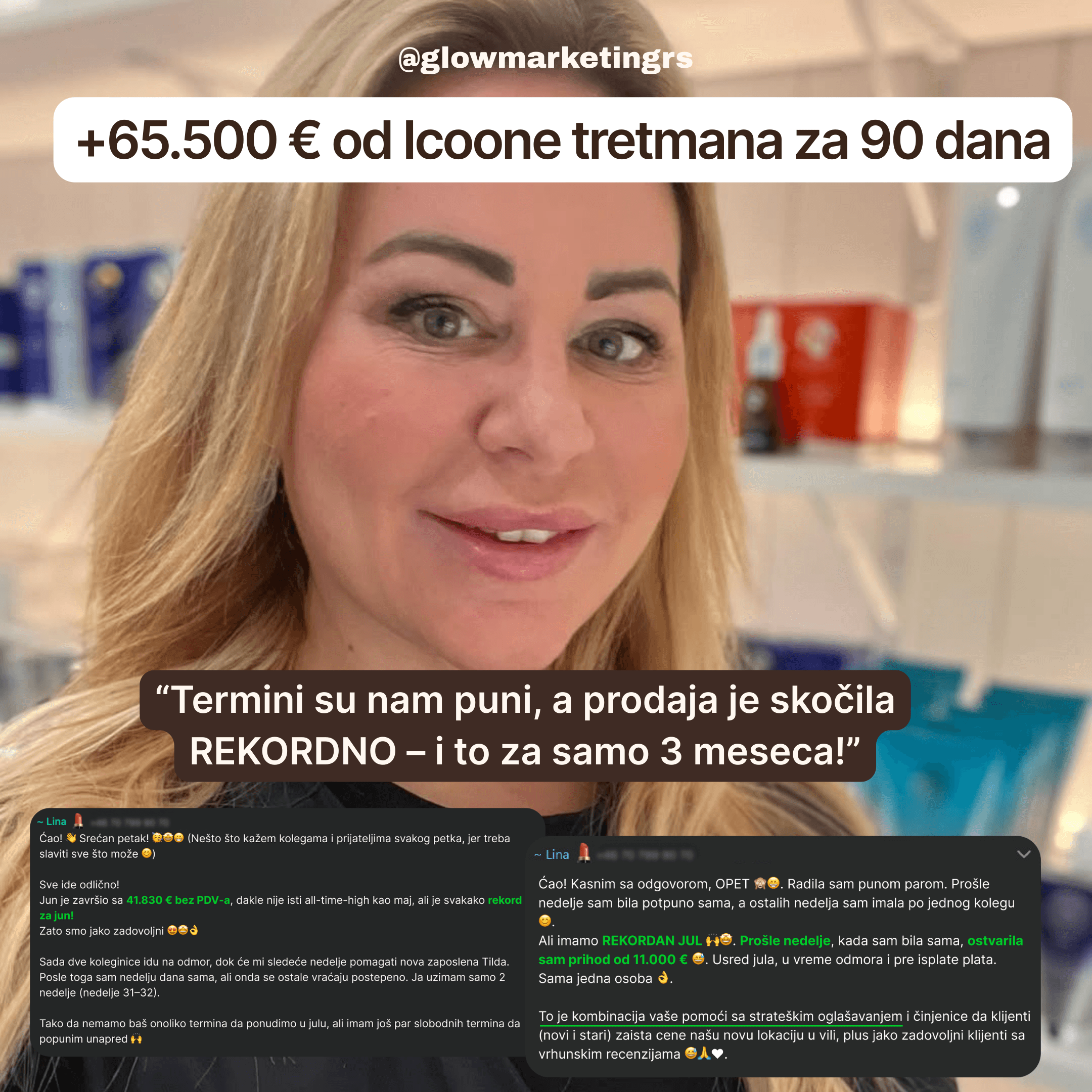 Sa našim sistemom sve se promenilo. Za samo 3 meseca dočekali su preko 100 novih klijenata i prodali veliki broj paketa lasera i PRX tretmana. To je donelo oko 45.000 € prodaje i stabilan priliv novih klijenata koji danas drže njihov kalendar punim.